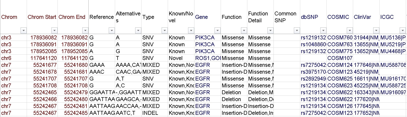 乳癌における150以上のSNV/Short InDel、TP53のコーディング領域、下記3遺伝子のCNVをターゲット。 【主な対象SNV/Short InDel】 PIK3CA:E545K, H1047R AKT1:E17K ESR1:抗エストロゲン耐性に関与する変異 TP53:機能喪失変異 ERBB2:抗HER2療法の感受性に関与する変異 【CNV対象遺伝子】 CCND1、ERBB2、FGFR1 |