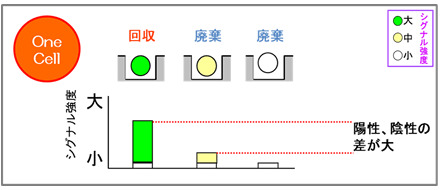 蛍光顕微鏡で観察しながら、ウェルに満たされた数万~数十万個の細胞から1個ずつ解析するため、陽性率0.01%以下のレア細胞のスクリーニングも可能です。