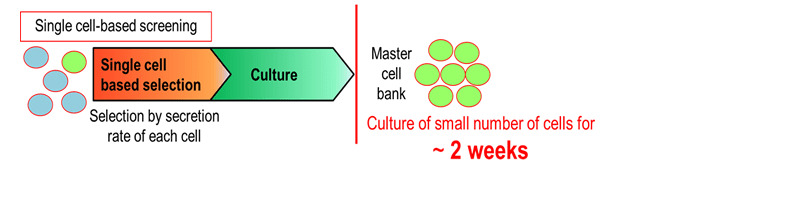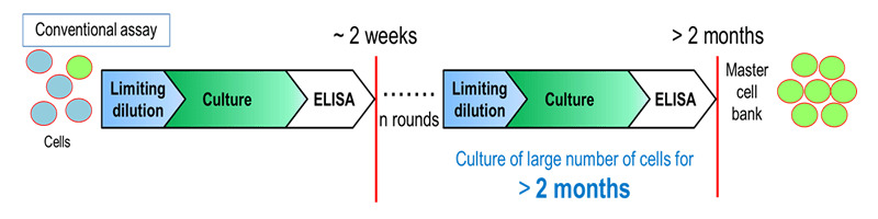 AS ONE Cell Picking System専用のイムノチャンバーを用いて、抗体分泌細胞(B細胞、CHO細胞、ハイブリドーマなど)で分泌能が最も高い細胞を1細胞単位で採取します。これにより、従来の限界希釈法では2ヶ月以上の期間を要していたクローン回収が、2週間に短縮されます。従来よりもより正確に、かつ迅速に抗体高分泌細胞を得ることができます。