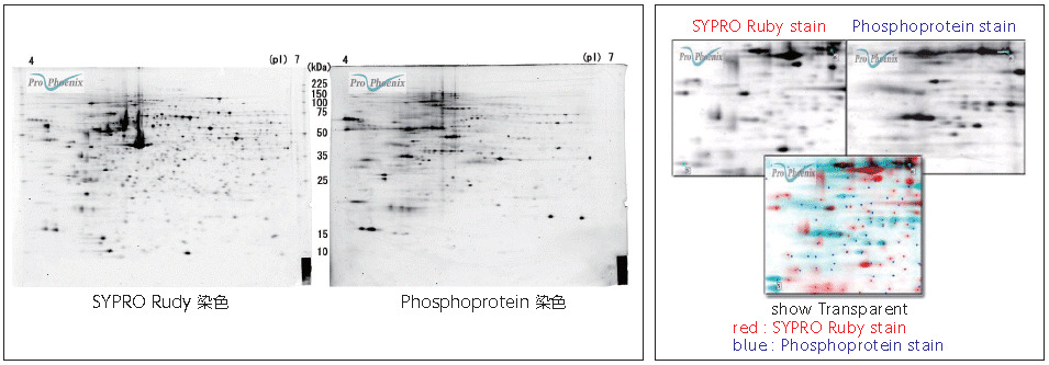 りん酸化タンパク質を特異的に検出するりん酸化タンパク質蛍光染色法を用いて1枚のゲルをりん酸化タンパク質染色・SYPRO
