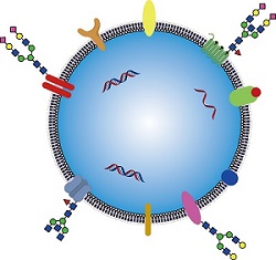 エクソソームは、細胞外小胞(extracellular vesicles)に分類される微細膜小胞(~200nm)で、遺伝子、タンパクなどを内包し、膜上には膜貫通タンパクが存在しています。(