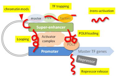 SE-LncRNAは、スーパーエンハンサーとともに、転写因子トラッピング、クロマチンルーピング、クロマチン修飾、PolIIローディング、及び転写抑制因子の放出のメカニズムによって近くの遺伝子発現を活性化します(