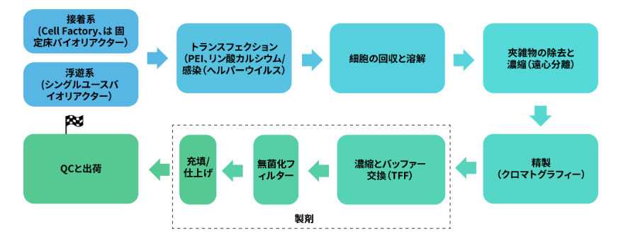 VectorBuilderは、様々な種類のウイルスの作成に関する広範な専門知識と経験を持っています。VectorBuilder社は、遺伝子治療薬開発パイプラインに沿った、あらゆる要求に応えるため、様々な規模と品質のウイルス製品を提供します。アデノ随伴ウイルス (AAV) とレンチウイルスの大規模GMP製造のためのプラットフォーム技術を確立し検証しています。またアデノウイルス、 MMLV、単純ヘルペスウイルス (HSV)、そして水泡性口炎ウイルス (VSV)など、他の種類のウイルスベクターの製造経験も豊富にあります。創薬研究、臨床研究、臨床試験、商品化など様々なダウンストリームのアプリケーションをカバーした、異なるグレードのウイルスをご提供します。
