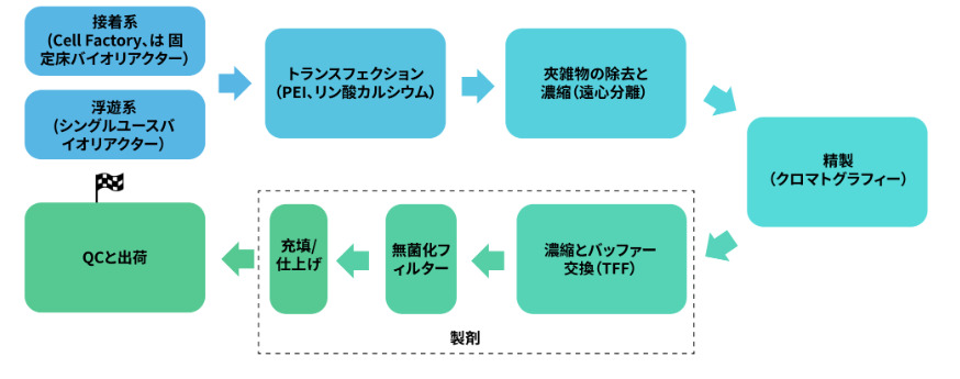 AAVパッケージングはHEK293細胞を使用し、培養条件は接着培養(Cell Factory または 固定床バイオリアクター/fixed-bed bioreactors) または無血清浮遊培養 (200 L までのシングルユーズのバイオリアクターを使用)に対応しています。 昆虫由来のSf9細胞を使用したAAVパッケージングにも対応しています。バッチ当たりの最大スケールは1017 GCです。 (fig.2)