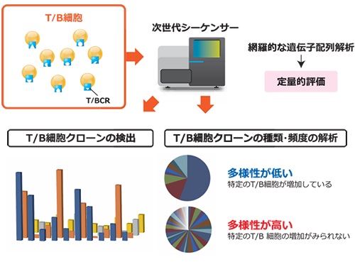 定量的にTCRやBCRの遺伝子配列を決定し、リンパ球クローンの種類や頻度を解析します。