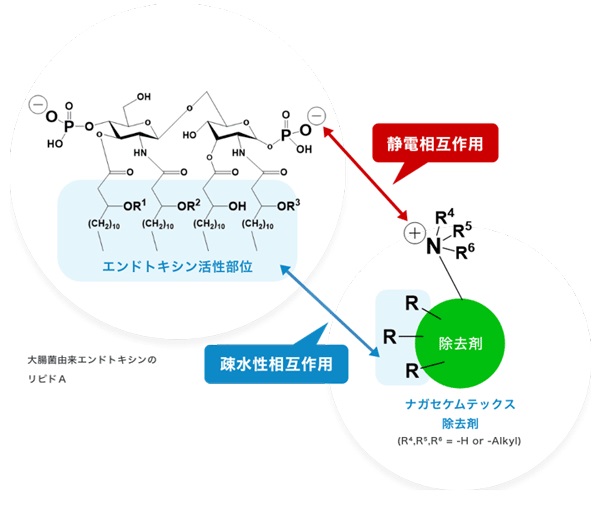 NAGASEグループの中核製造会社であるナガセケムテックス株式会社では、熊本⼤学との共同研究にて精密有機合成技術を駆使し、エンドトキシン除去剤を開発いたしました。本除去剤はエンドトキシンの吸着容量が⼤きく、エンドトキシンのみを特異的に除去することが可能であることから、これまで難しかった⾼粘性液体(⽣体ポリマー、⾜場材など)からでもエンドトキシンを効率的に除去できることが期待されます。(