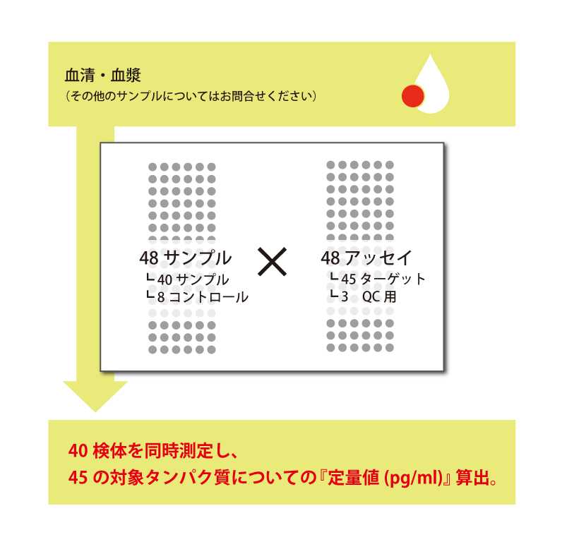 血清・血漿中のバイオマーカーを pg/mL 単位で定量。45因子 x 40 検体を同時測定。