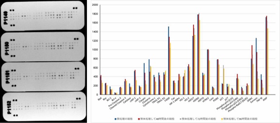 検体による経時変化によるがん細胞への増殖抑制するプロセスについて、OBMリサーチセンターで R&D社の抗体アレイキット(商品コード:ARY009)で 35種類のアポトーシス関連因子の発現変化を同時測定することで調べた。検体により細胞周期の進行を停止させるp21の上昇や抗アポトーシスタンパク質であるsurvivinの抑制などがみられた。