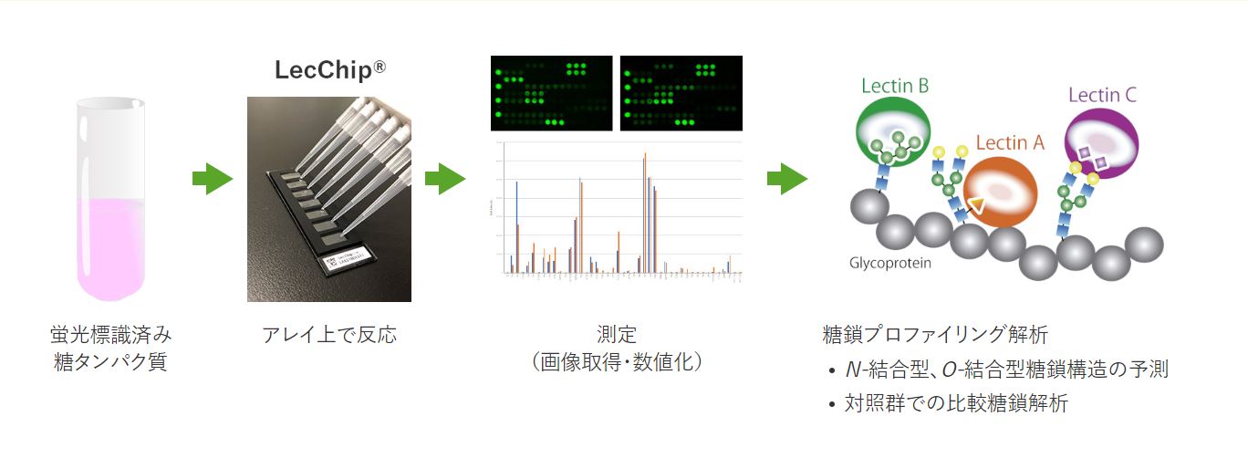 レクチンマイクロアレイ(Lectin MicroArray:LMA)解析は、レクチンと呼ばれる糖結合性タンパク質をアレイ状に配置したLecChip®を利用し、レクチンの結合パターンから糖鎖構造を推測する技術です。