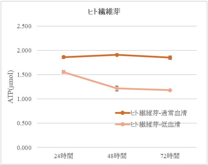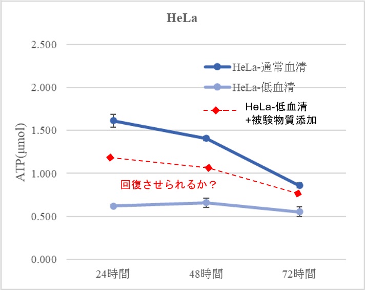 低血清培養により、低下したATP産生量を被験物質がどのくらい回復させられるかを検証する試験になります。