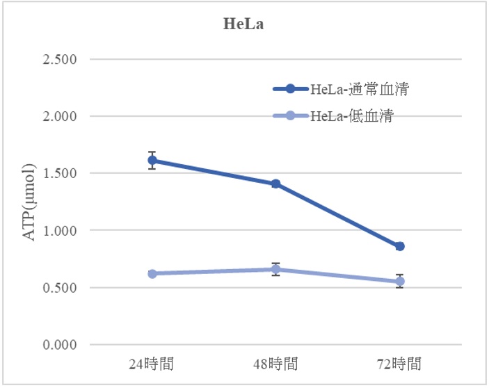 予備試験:各種細胞における通常血清と低血清下でのATP産生量の確認