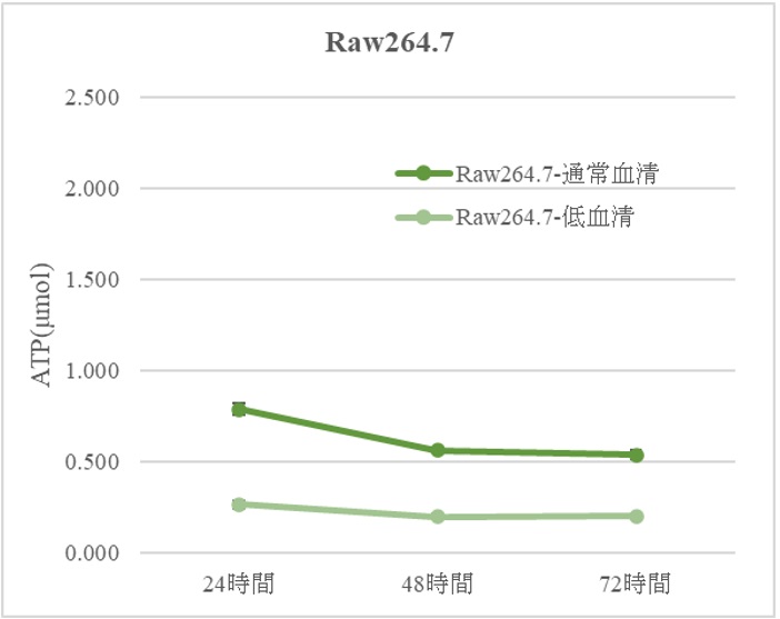 上皮系ガン細胞であるHeLaは24時間の時点でも、通常血清と低血清で大きな差が認められており、72時間では差が少なくなる傾向にあった(fig.2)。 一方、マクロファージ系のRaw264.7では、24~72時間のいずれにおいても差は大きくなく、時間経過による差の変動も少ない結果となった(fig.3)。 ヒト正常細胞であるヒト線維芽細胞では、24時間では差が小さかったものの、48~72時間で差が大きくなる傾向が認められた(fig.4)。 よって、HeLaでは24時間、Raw264.7では24時間、ヒト線維芽細胞では48 or 72時間の培養時間が検討に最適な条件であるということが明らかとなった。