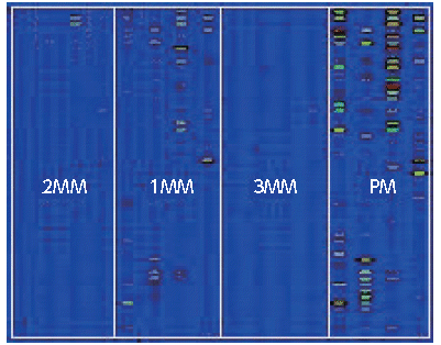 LC Sciences社のmicroRNA、non-coding RNAプロファイリング用DNAマイクロアレイプローブは、シリコンチップ上に刻まれた約3,700個のウェル(fig.2)内でin situ合成されます。in situ合成したアレイは、ピンスポットタイプやインクジェットタイプのアレイに比べてスポット-スポット間、アレイ-アレイ間のばらつきが減少し、均一なアレイが得られます。