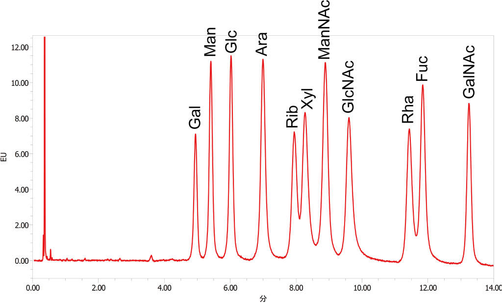 標準品として、ガラクトース (Gal)、マンノース (Man)、グルコース (Glc)、アラビノース (Ara)、リボース (Rib)、キシロース (Xyl)、N-アセチルマンノサミン (ManNAc)、N-アセチルグルコサミン (GlcNAc)、ラムノース (Rha)、フコース (Fuc)、N-アセチルガラクトサミン (GalNAc) を使用いたします。
