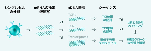 イムノジェネテクス社 シングルセルTCRレパトア解析サービスでは、scRNA-seqとTCRレパトア解析を統合し、個々のT細胞について遺伝子発現情報と、クローンの再構成に必要なTCRα/βペアの配列を同時に解析できます。