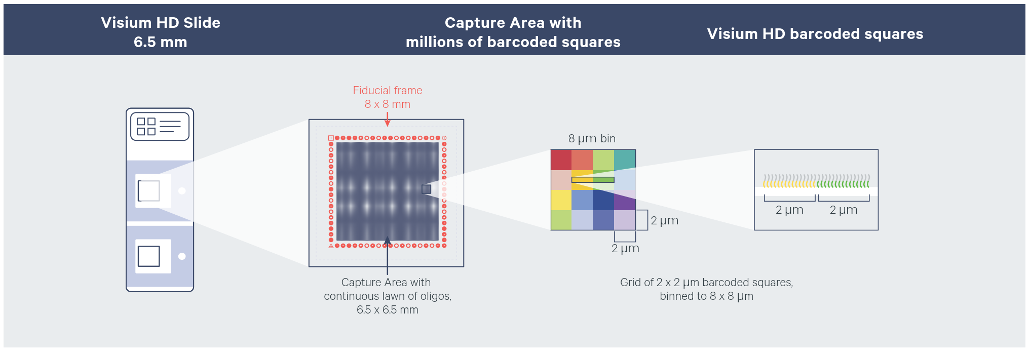 位置情報を2 x 2μmの正方形で隙間なく取得、 データは2μmおよび複数のbinサイズで出力 メーカー推奨解析binは8 x 8μm(fig.1) |