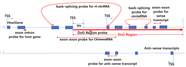 DoG RNA(遺伝子下流転写産物):ホスト遺伝子の3’末端ポリアデニル化シグナルから3kb先 DoGホスト遺伝子由来pre-mRNA:ホスト遺伝子由来pre-mRNAのエクソン-イントロンジャンクション DoG RNAの下流センスオーバーラップLncRNA:lncRNAのエクソン-エクソンジャンクション DoG RNAの下流センスオーバーラップCircRNA:circRNAのバックスプライシングジャンクション キメラ RNA(DoGのリードスルー転写産物および下流のリードキメラ遺伝子の成熟シス-スプライシング産物):キメラ RNAのシス-スプライシングジャンクション rt-circRNA(リードスルー転写産物のバックスプライシングによって産生されるcircular RNA):rt-circRNAのバックスプライシング 下流アンチセンスオーバーラップlncRNAまたはDoGのコーディングRNA:転写産物のエクソン-エクソンジャンクション ショウジョウバエのスパイクイン RNA:コントロールとしてのショウジョウバエのコーディングRNAをコードに特異的なプローブ |