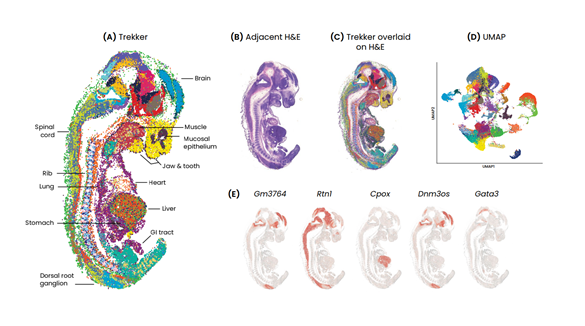 E11マウス胚由来の25µm組織切片をTrekkerタイル(10mm x 10mm)に供し、57,545個の核の空間解析を行った。
