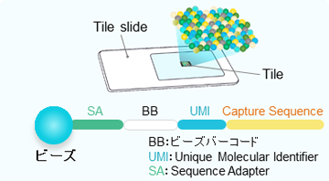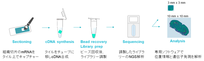 凍結組織などを提供いただき、位置情報バーコードおよびmRNAキャプチャー配列を持つビーズ(直径10μm)が敷き詰められたTile Slide上に、凍結組織切片を配置する事で、組織中のmRNAをビーズで捕捉し空間位置情報を含むcDNAライブラリーを調製します。イルミナ社シーケンサー(NovaSeq)でシーケンスし、得られたデータとビーズ位置情報を専用ソフトで解析することで、高感度な空間遺伝子発現マップを構築します。(