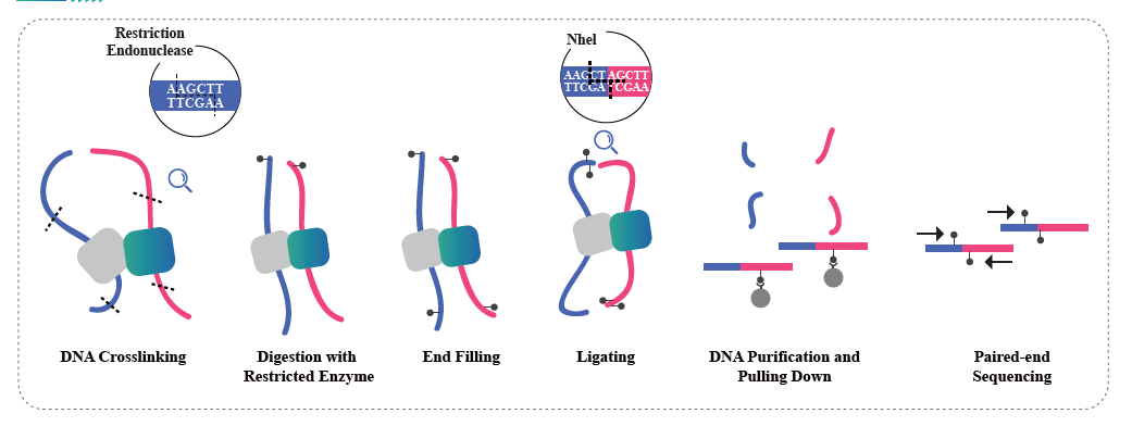 - Hi-C実験では、制限酵素による切断、そして付着末端の修復が行われ、その際にビオチンが付加されます。その後、相互作用を保持したまま、得られた平滑末端を環状化します。続いてDNAはストレプトアビジンビーズでプルダウンされ、その後のライブラリー調製のために精製されます。