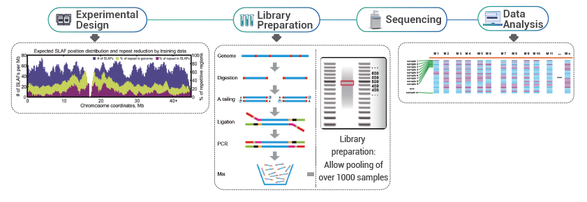 - 高効率な酵素消化:in-silicoプレ設計およびプレ実験の実施により、染色体上のSLAFタグの均等な分布(1SLAF タグ/4kb)および反復配列の減少(<5%)を備えた最適な設計を保証します。