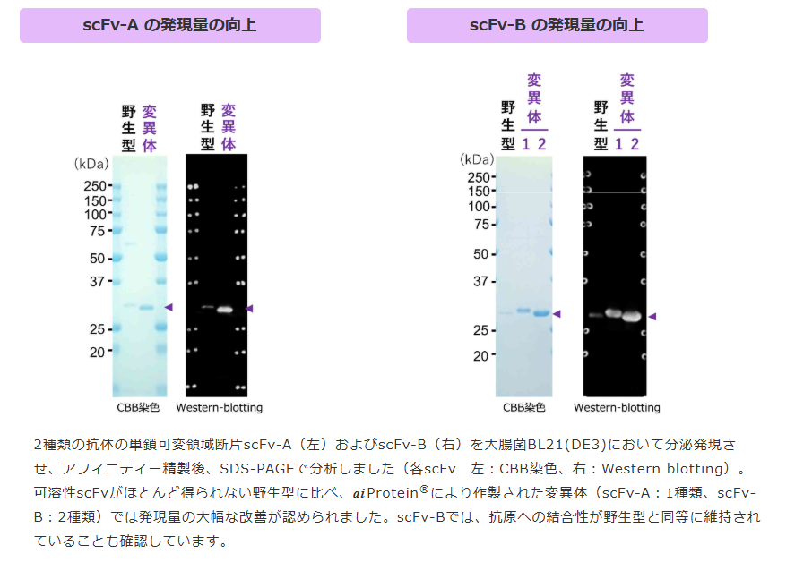 ® を利用し、抗原結合性への影響を最小限に、抗体の発現量・安定性などの複数の特性値をバランスよく同時に向上させるサービスです。aiProtein