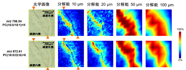 近年MALDI法による質量分析を用いて生体組織切片から直接、対象とする生体分子 (低分子代謝産物,脂質,ペプチドやタンパク質など)を解析する方法が注目を集めており、 疾病部位におけるバイオマーカー探索への応用が期待されています。