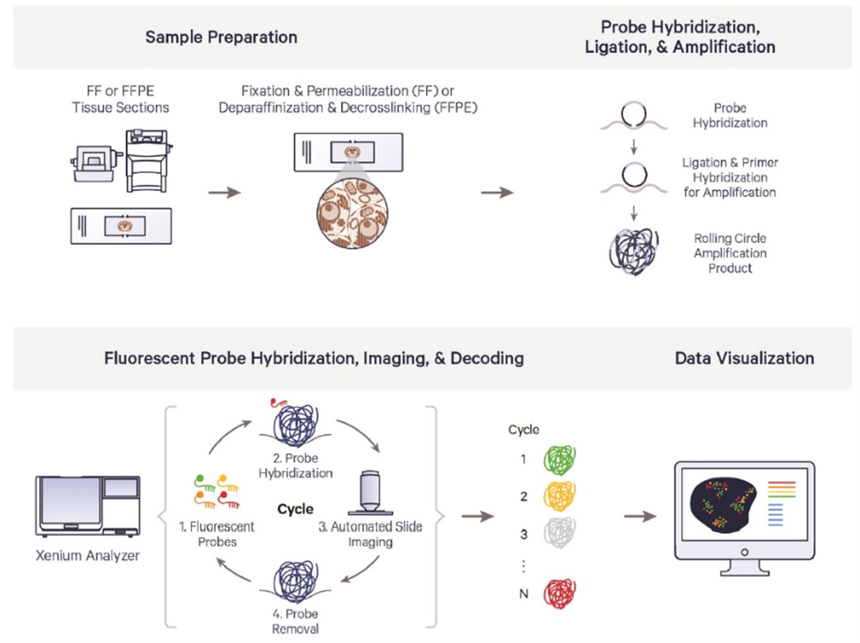Xeniumでは、Padlock probeと呼ばれる、標的遺伝子配列に相補的な配列を両端に持つ南京錠型プローブを使用します。ターゲットmRNAに正確にハイブリダイズしたプローブのみが、両端のライゲーションにより環状構造を形成します。この環状プローブに対してRolling Circle Amplification(RCA)を行うことで、蛍光色素結合配列を多数含む長鎖DNAが生成され、高感度かつ高特異的な検出が可能となります。FFPEブロックから作製した組織切片スライドに対し、このPadlock probeおよびRCAケミストリーを用いることで、最大約5,000遺伝子のRNA発現を高い空間解像度で検出します。取得されたデータは、10x Genomics社提供の専用解析プラットフォーム Xenium Onboard Analysis により、細胞セグメンテーション、遺伝子発現解析、空間可視化まで一貫して解析可能です。