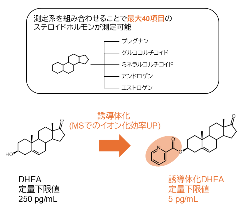 ステロイドホルモンに特化した独自の前処理および誘導体化技術により、LC-MS/MSを用いた高感度かつ再現性の高い測定をご提供します。複数の測定サービスを組み合わせることで、最大40項目のステロイドホルモンが測定可能です (