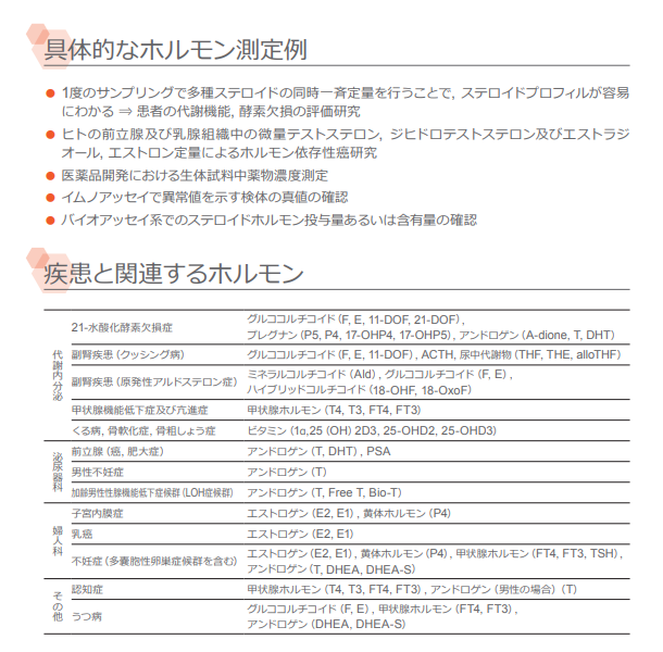 - 測定系を組み合わることで最大40項目のステロイドホルモンが測定可能です。