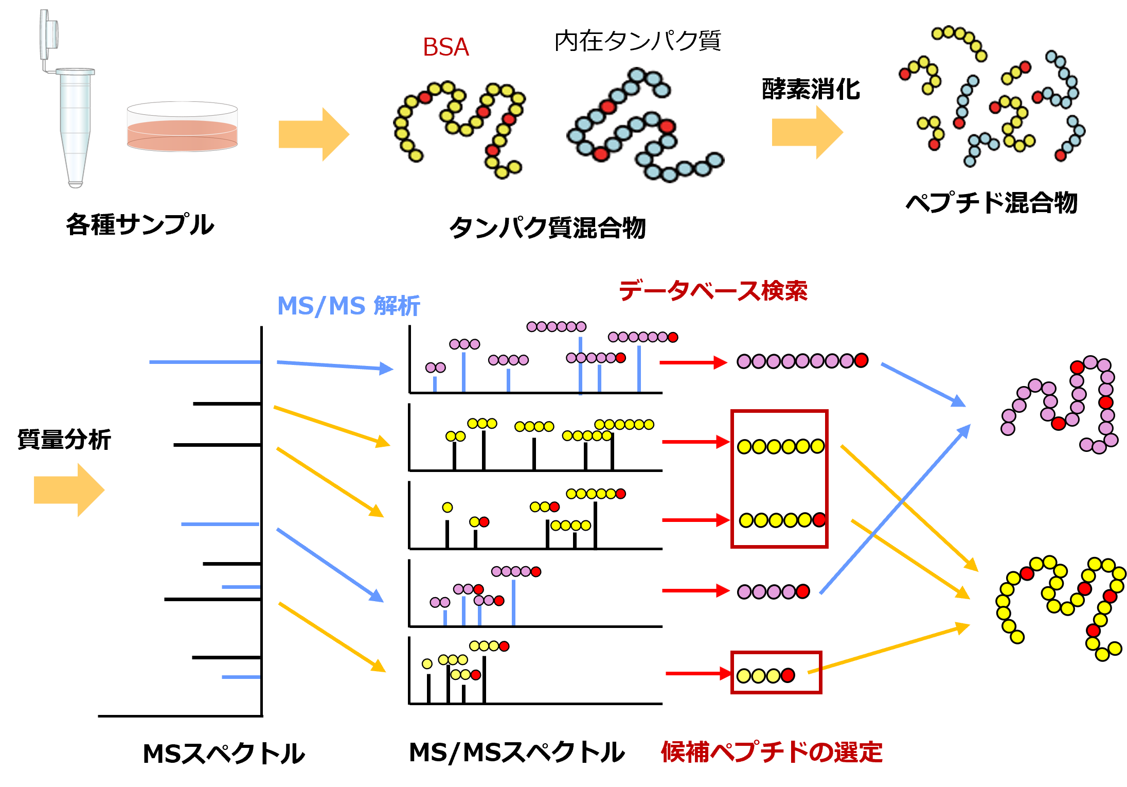 1.通常のタンパク質は分子量が大きく、そのままでは良好なMS/MSスペクトルが得られないため、トリプシンなどの酵素処理によってペプチド断片にします。