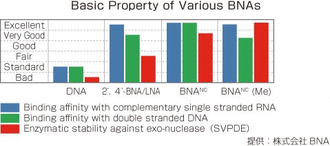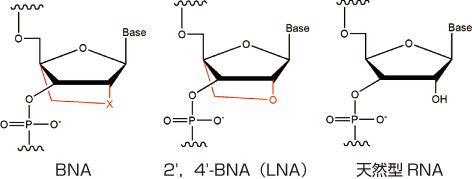 fig.1)の赤線表示の構造)、標的となるDNAやRNAに対する結合親和性を高め、かつヌクレアーゼ(核酸分解酵素)耐性をも獲得する架橋構造を核酸分子内に持つという、これまでの人工核酸とは異なるコンセプトで設計されました。RNA、一本鎖DNA、二本鎖DNAを分子標的としたゲノムテクノロジー(アンチセンス法、アンチジーン法、RNAi、デコイ法、遺伝子相同組換え、リボザイム、DNAエンザイムなど)に有用です。現在、核酸医薬品開発や診断システムなどの共通基盤材料として2’,4’-BNA(LNA)オリゴヌクレオチドの研究開発が進められています。