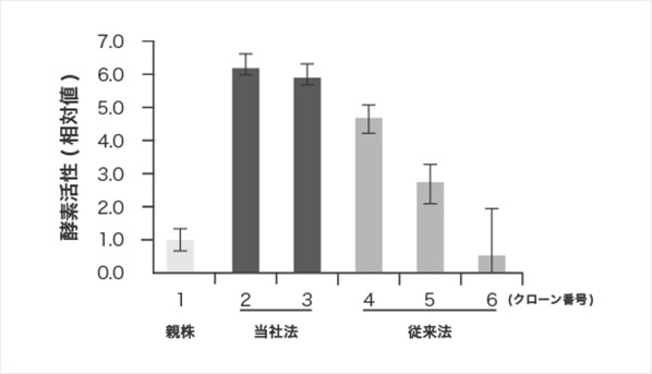 本法または従来法でA酵素安定発現細胞を作製し、A酵素の活性を比較した。従来法(4、5、6)と比べ、本法で作製したA酵素安定発現細胞(2、3)はいずれのクローンも高い酵素活性を示した。(