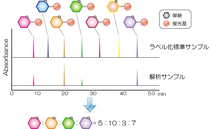 単糖を蛍光基でラベル化し、標準品と比較することで試料中の各糖の組成解析、定量行います。