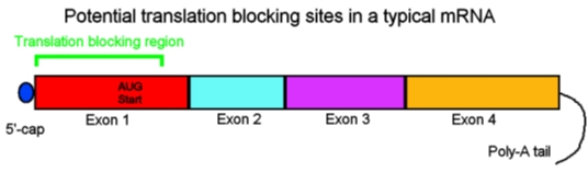 特定のmRNAの翻訳を阻害するためには、モルフォリノオリゴの一部が開始コドンの上流に結合していればよいので、5’-UTR(非翻訳領域)内の標的部位に相補的なモルフォリノオリゴを結合させます。翻訳開始複合体の一部であるリボソームの小サブユニットが5’キャップまたは内部リボソーム侵入部位(IRES)から開始コドンに向かって移動する際に、その経路上に結合したモルフォリノオリゴが小サブユニットの進行を停止し、成熟したリボソームの形成を中断することができます。なお、5’-UTR内にイントロンがある場合は、開始コドンがその後のエクソン内に現れることにご留意下さい。