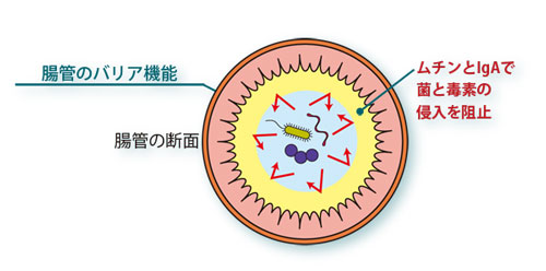 消化管内では IgA とムチン等によって、腸内細菌や腸内細菌が産生する毒素が生体内に侵入してくることを阻止しています。 (fig.7)コスモ・バイオ社では腸管バリア機能として、糞便中のIgA 含量およびムチン含量を測定します。(fig.8)(fig.9)IgAはELISA、ムチンは自社開発した蛍光測定キット(品番:FFA-MU-K01)にて測定致します。