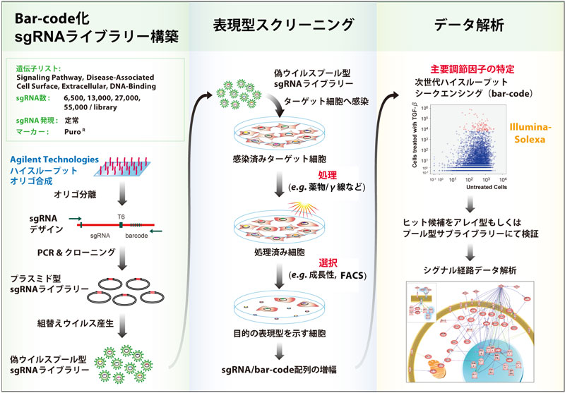 各sgRNAコンストラクトには特異的なバーコード配列が導入されており、次世代シーケンサーで検出することで表現型選抜後の候補遺伝子の効率的な同定が可能です。