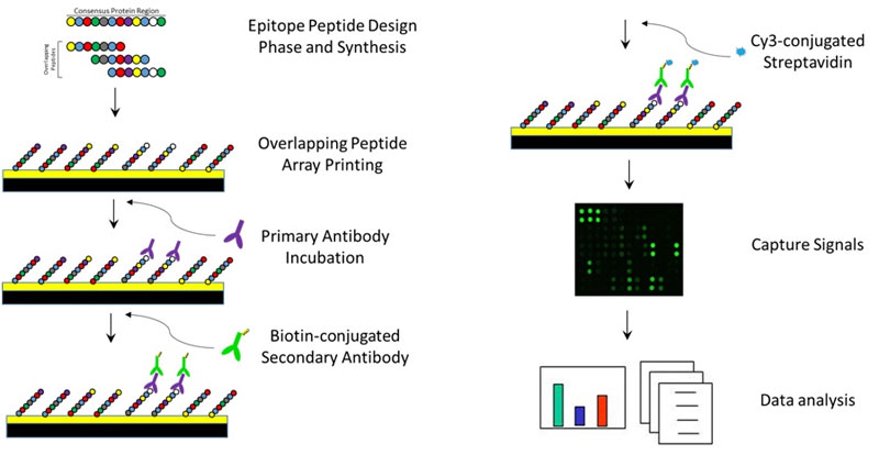 高密度ペプチドアレイは数百から数千の重複したペプチドを同時にスクリーニングできる効率的な手法です。