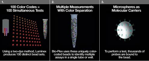 TM マネージャーソフトウェアでそれがどの測定対象であるかを判別します(例えば、36番のビーズには抗IL-2抗体が結合)。この様にして、Bio-Plex