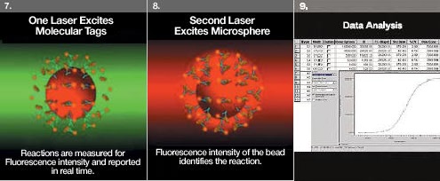 TM システムは、マイクロプレートの1Well内で複数のアッセイを識別することができます。波長532nmのグリーンレーザー(レポーターレーザー)は、二次抗体上の蛍光タグ(フィコエリスリン、PE)を同時に励起します。