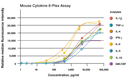 Powerful digital signal-processing algorithms accumulate fluorescent classification and reporter output from the beads. Bio-Plex Manager software then analyzes the data and presents them in meaningful form. Shown here is a standard curve from the simultaneous analysis of eight cytokines from mouse serum. Each data point represents the average of three individual samples.