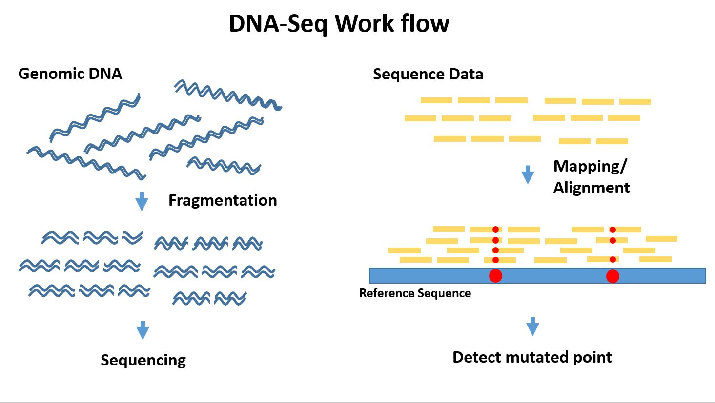 データ解析においては、既知のゲノム配列(リファレンス配列)にマッピングし、それぞれの染色体位置において変異が起こっている確率を算出します。