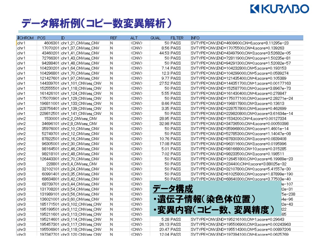 ヒトの場合は変異解析以外にも、染色体の構造変異、コピー数変異の解析が可能です。(
