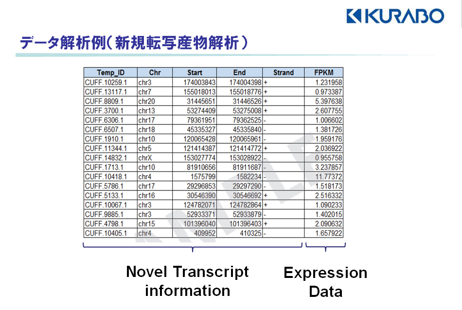 マッピングされた染色体の位置情報(染色体番号、塩基番号)、遺伝子コード方向(フォワード鎖/リバース鎖)、発現値(FPKM値)をエクセルファイルにて報告します。(