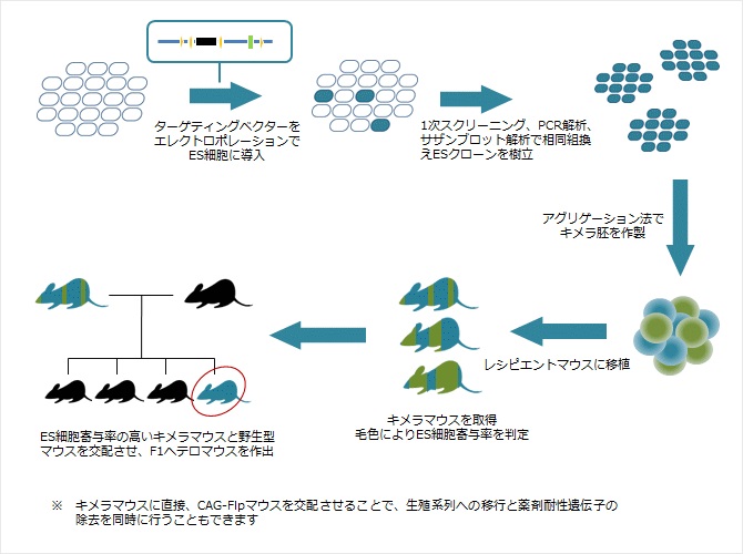F1ヘテロマウスとCAG-Flpマウス(あるいは、CAG-Creマウス)との交配により、薬剤耐性遺伝子を除去。さらに、野生型マウスと交配させ、Flpトランスジーン(あるいは、Creトランスジーン)を除去 | 約6か月 | ¥900,000 |