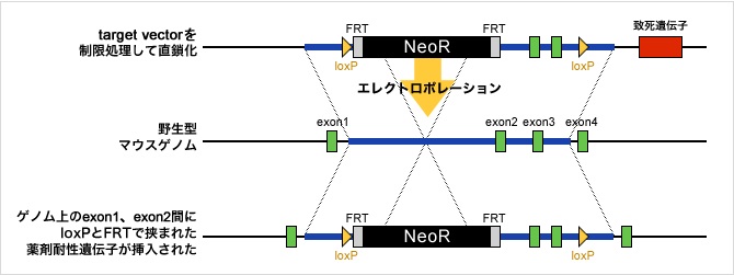 生存に必須な遺伝子の機能を解析するのに非常に有用なコンディショナルノックアウト(条件付き遺伝子破壊)のマウスを作製します。
