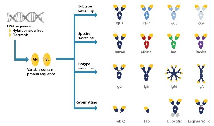 抗体の遺伝子情報を元に、ヒト型組換え抗体(リコンビナント抗体)を作製する受託サービスです。様々な改変を導入することも可能です。