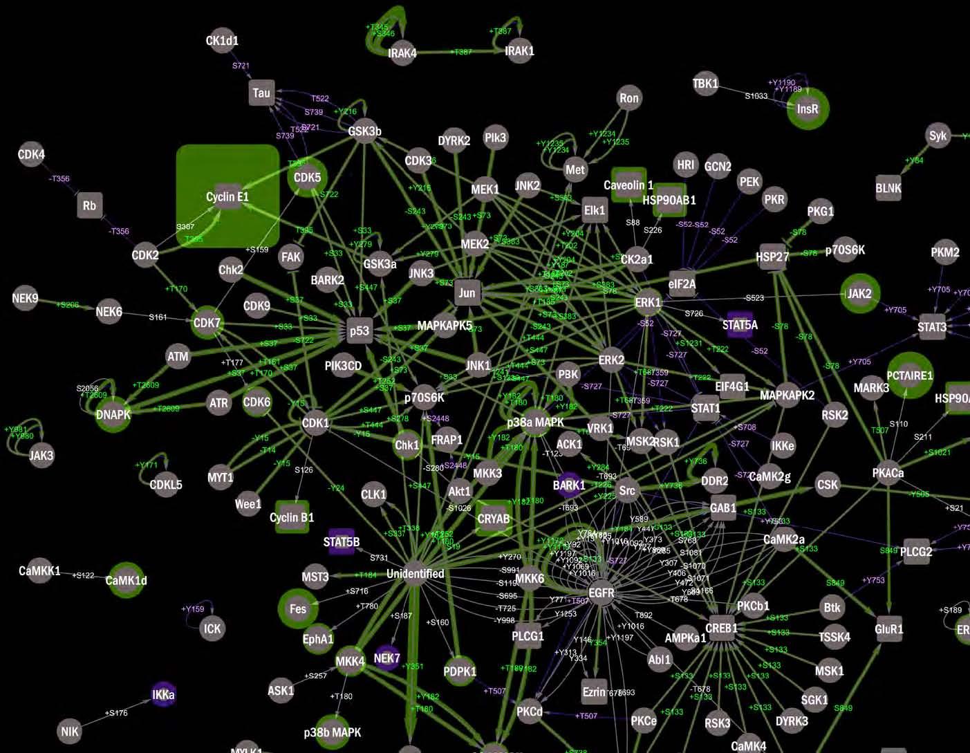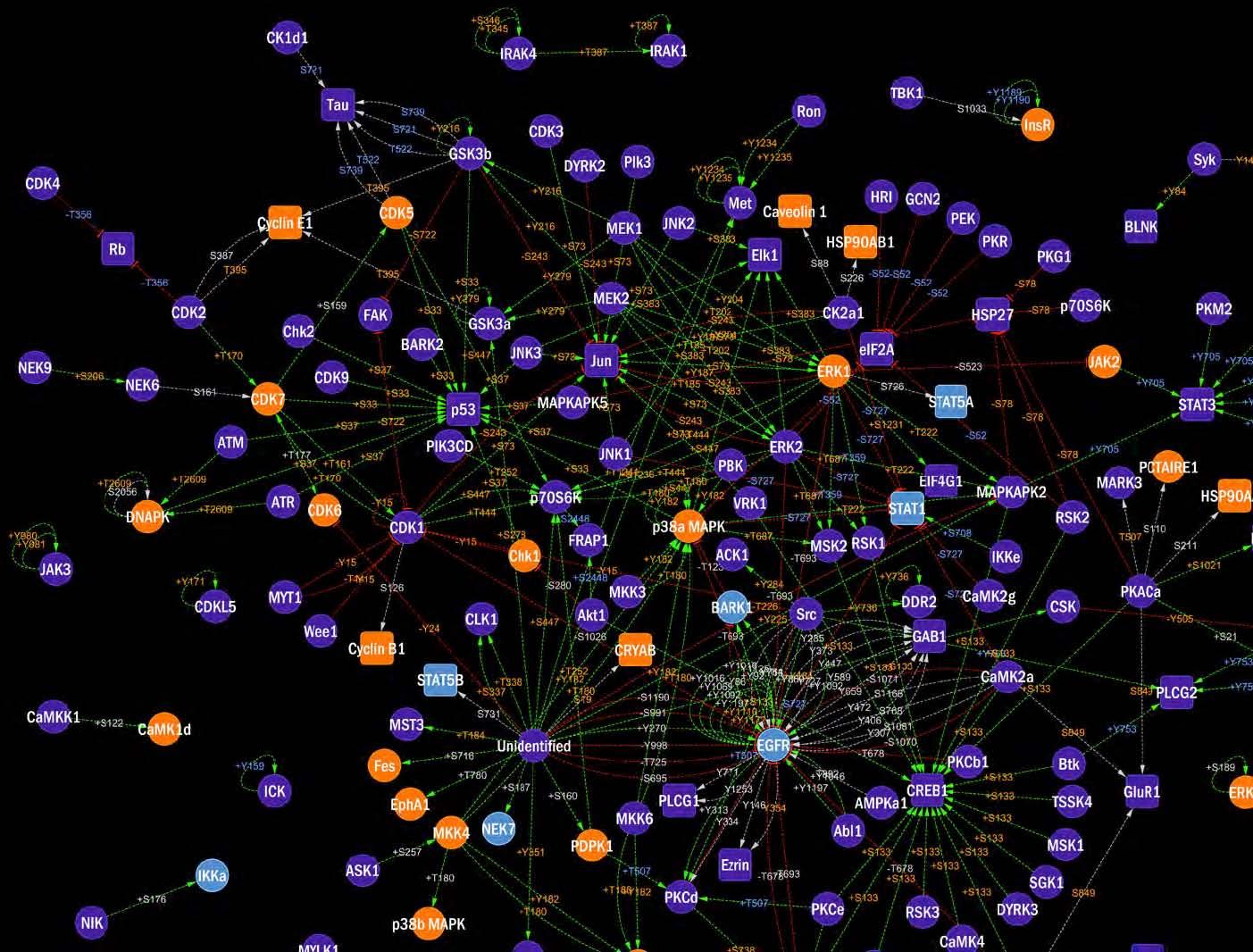マイクロアレイ解析は、データ解析が難しいことが知られていますが、Kinexus社では、得られたデータを基にしたパスウェイ解析が可能であり、ご希望パスウェイの変化をサンプル間で比較できます。