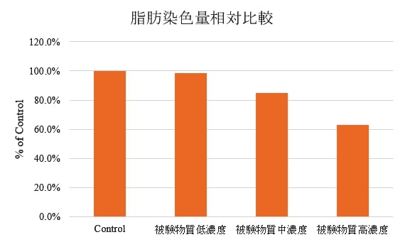 Controlでは、大きい脂肪滴が散見されたのと比較して、被験物質中濃度では、脂肪滴が小さくなり、脂肪の蓄積が抑制された。