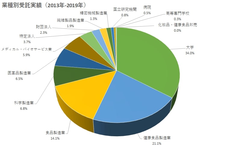 多業種のお客様よりご依頼いただいております。近年では特保・機能性食品に関連して食品や健康食品製造業の方や医薬品や化粧品原料の評価試験に関連して医薬品や化学製造業の方からのご依頼も増えております。(